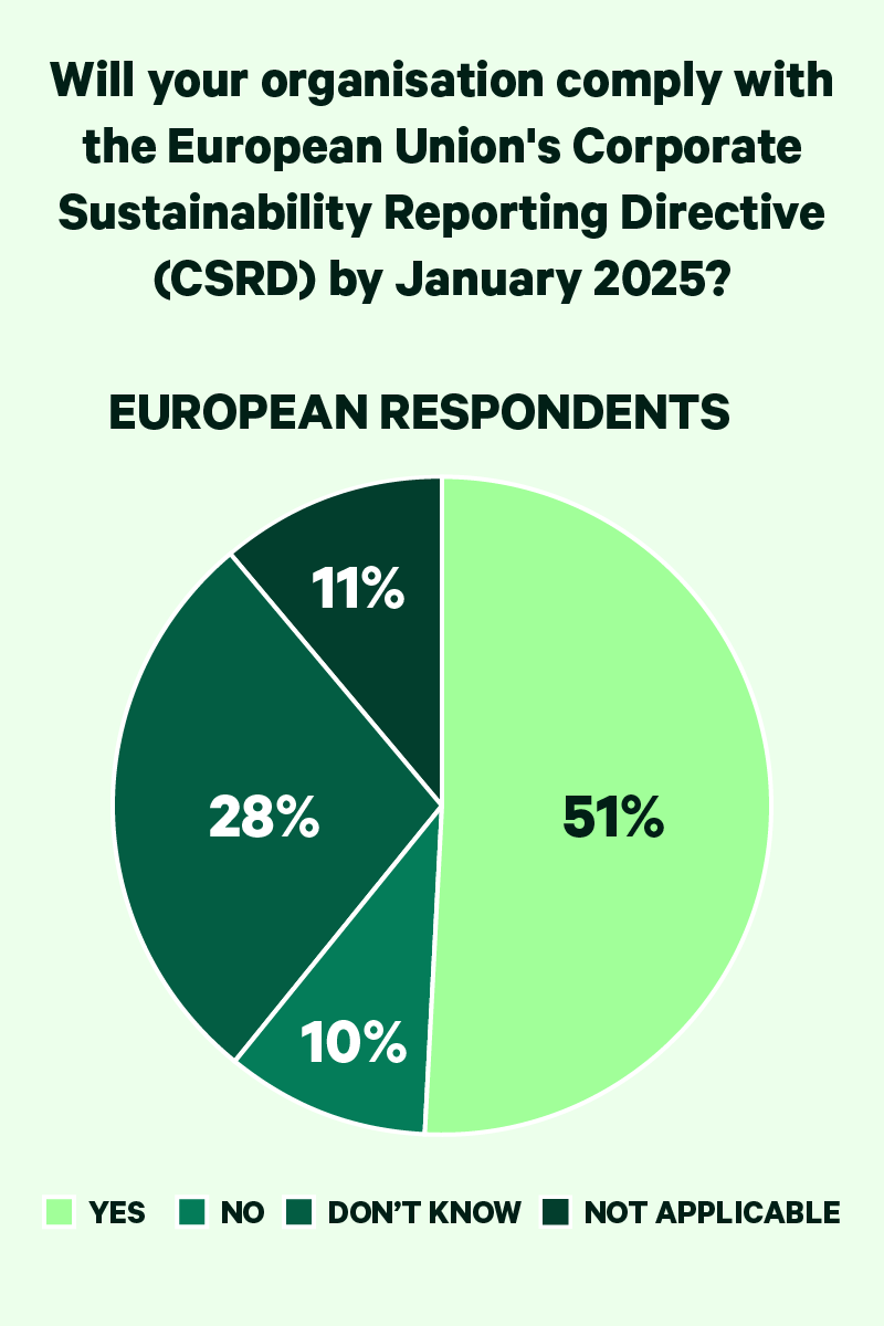 Looking at the regional results, it’s little surprise that complying with government regulation was selected by nearly two-thirds (65 per cent) of European respondents – compared with 41 per cent in the US – with CSRD reporting required of many EU-based companies from 2025.