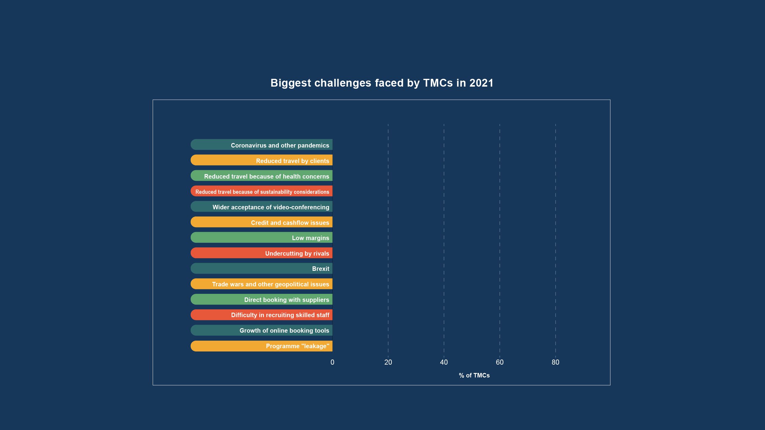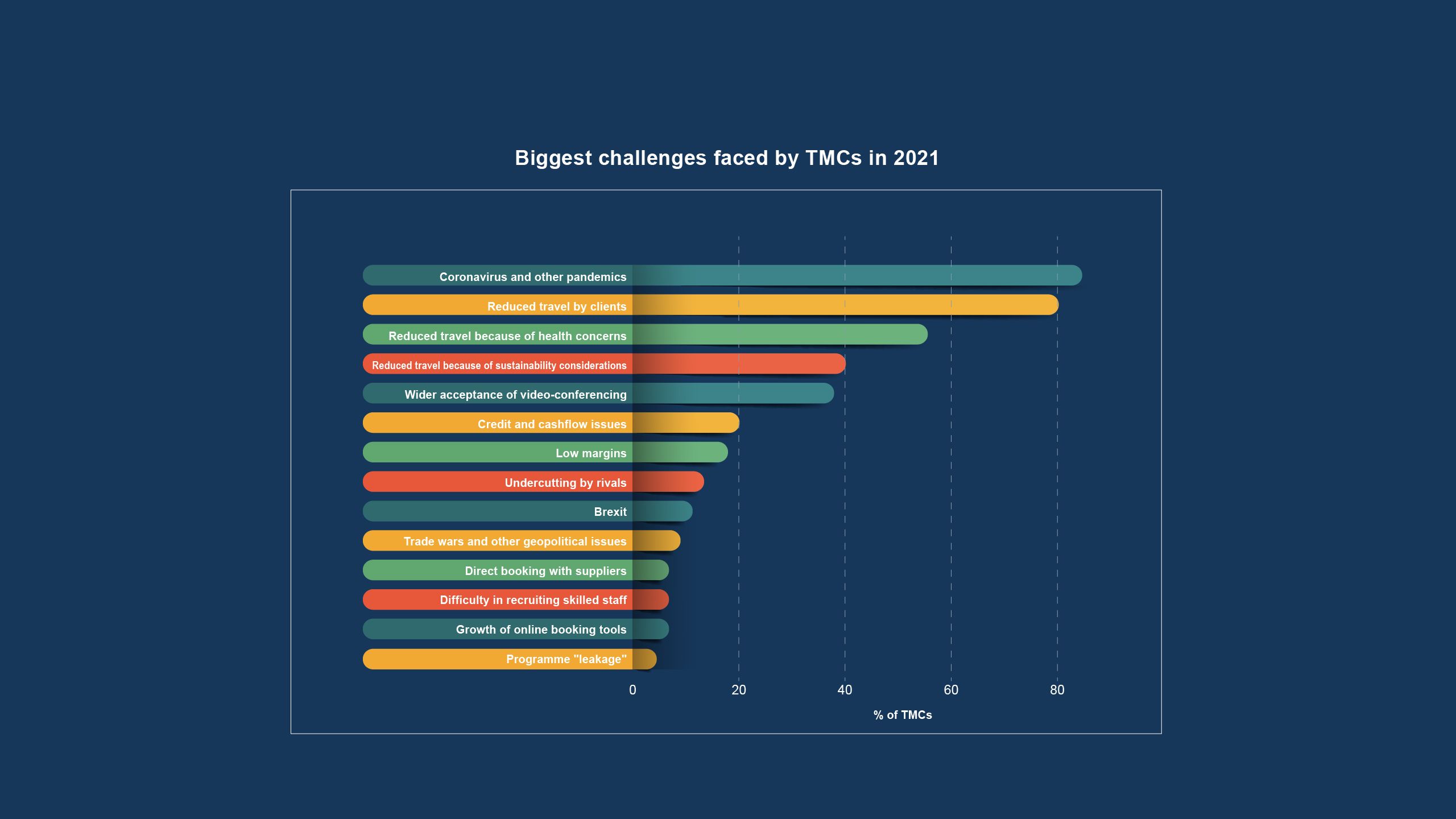 Our survey found that virtually every TMC recognises Covid as a major challenge in 2021 but reduced travel in general is also worrying them, with 80 per cent of those surveyed saying it is a challenger. The wider use of videoconferencing platforms, such as Zoom and Teams, is also concerning TMCs, as is a reduction in travel due to renewed focus on sustainability.