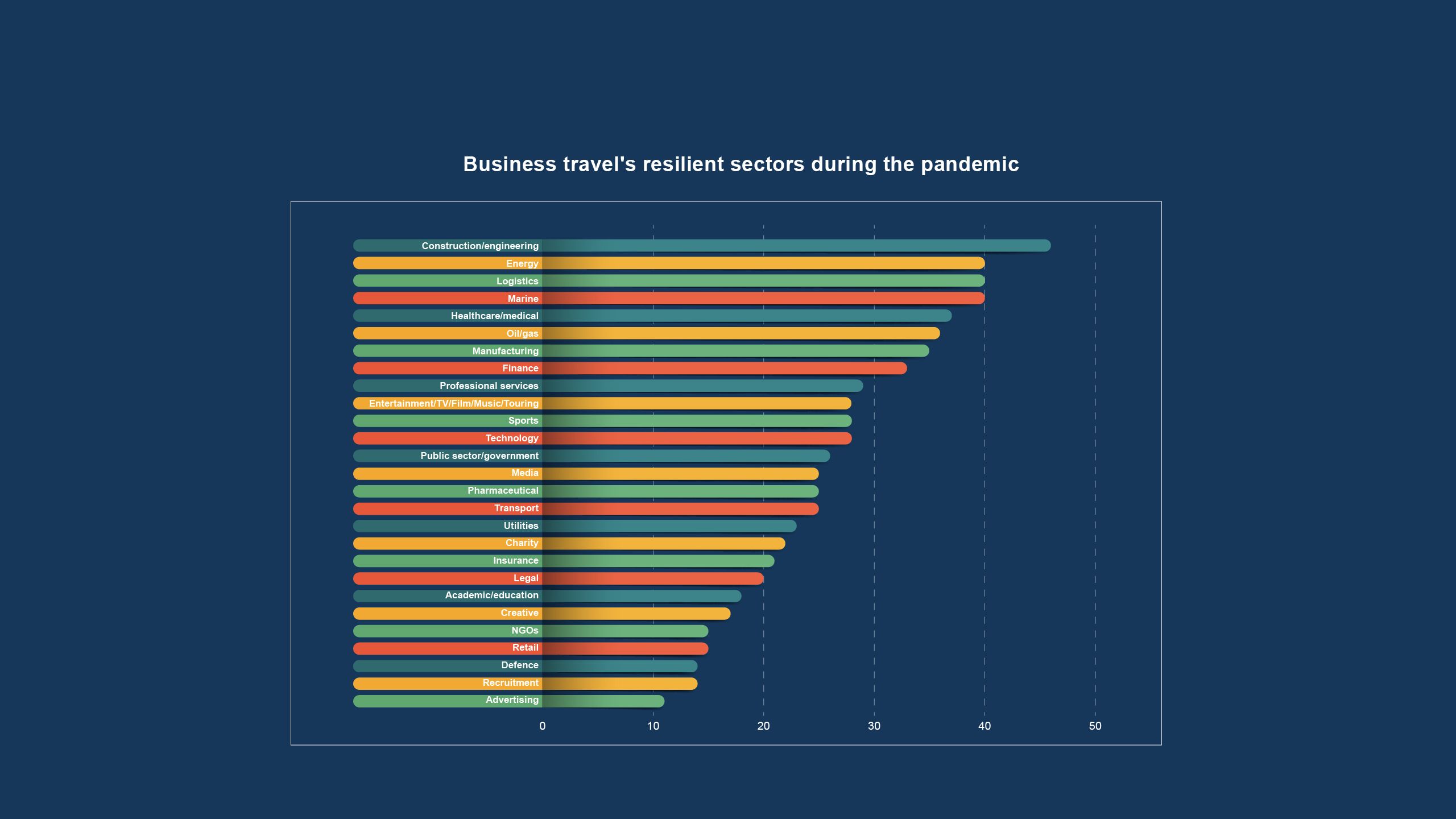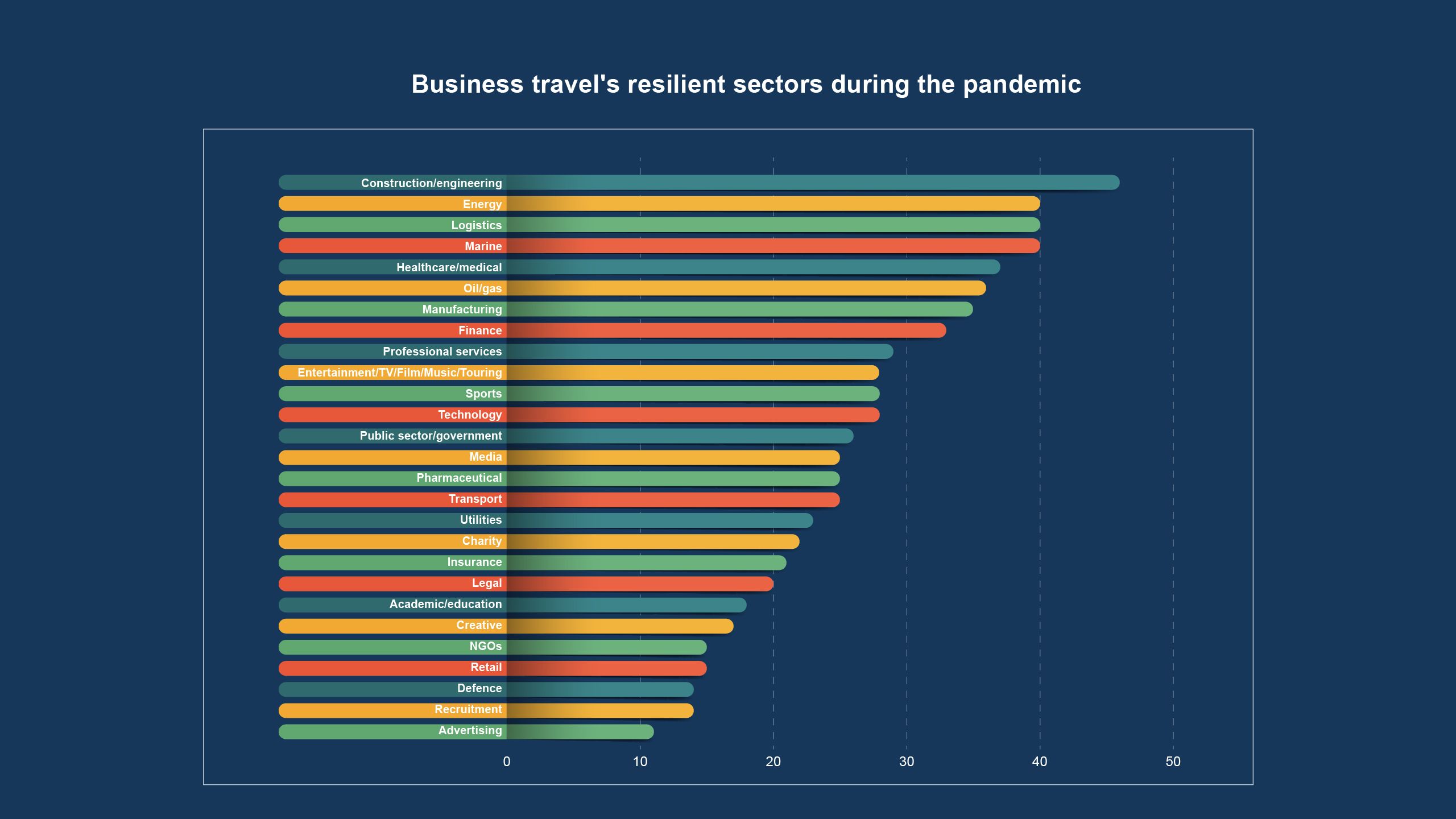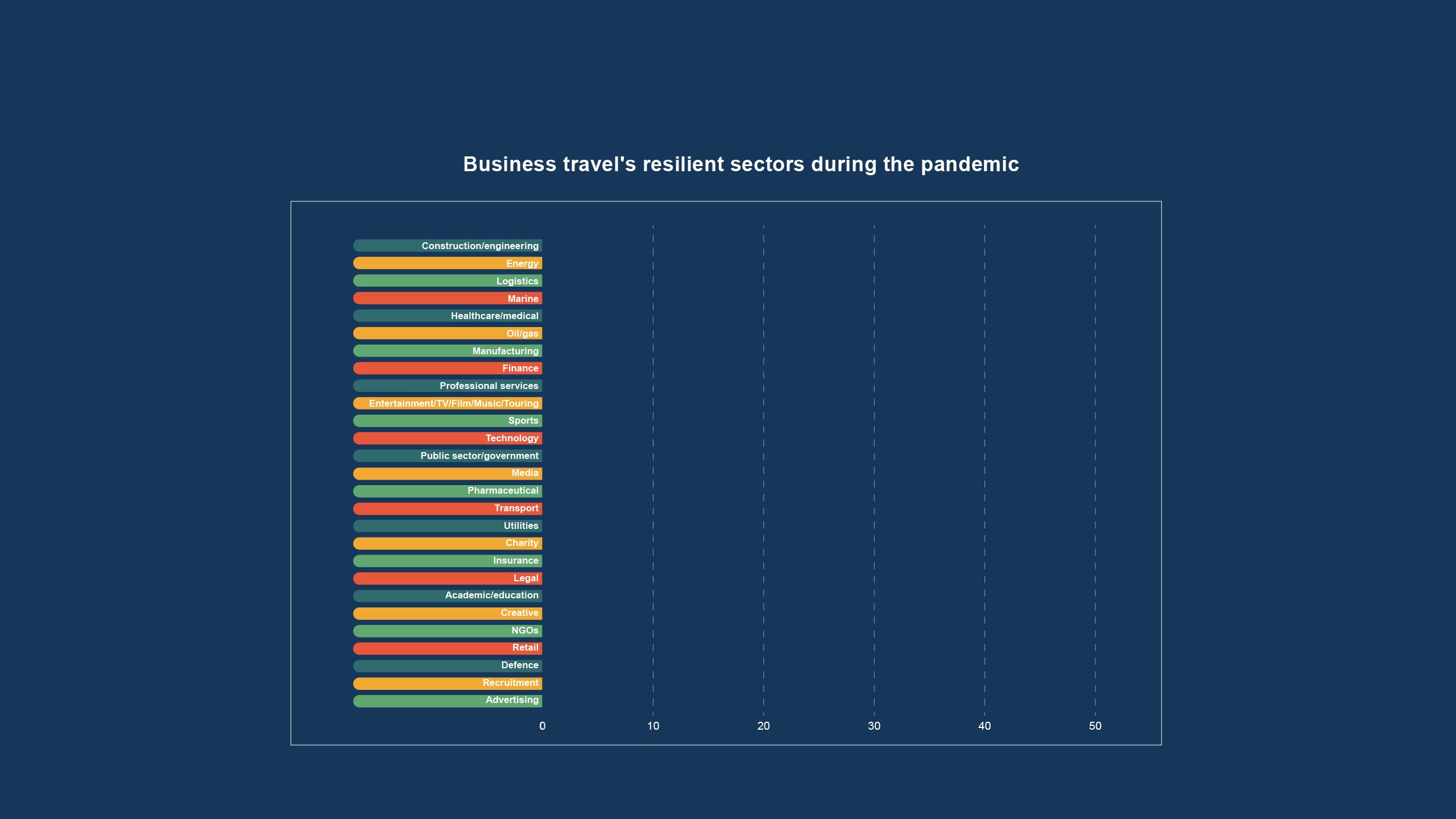The chart tells the story of the pandemic. Healthcare and medical, logistics and ‘essential’ sectors such as energy and oil and gas continued to travel, with some TMCs saying they were busier than usual. At the other end of the scale, sectors like retail, recruitment and advertising barely travelled at all.