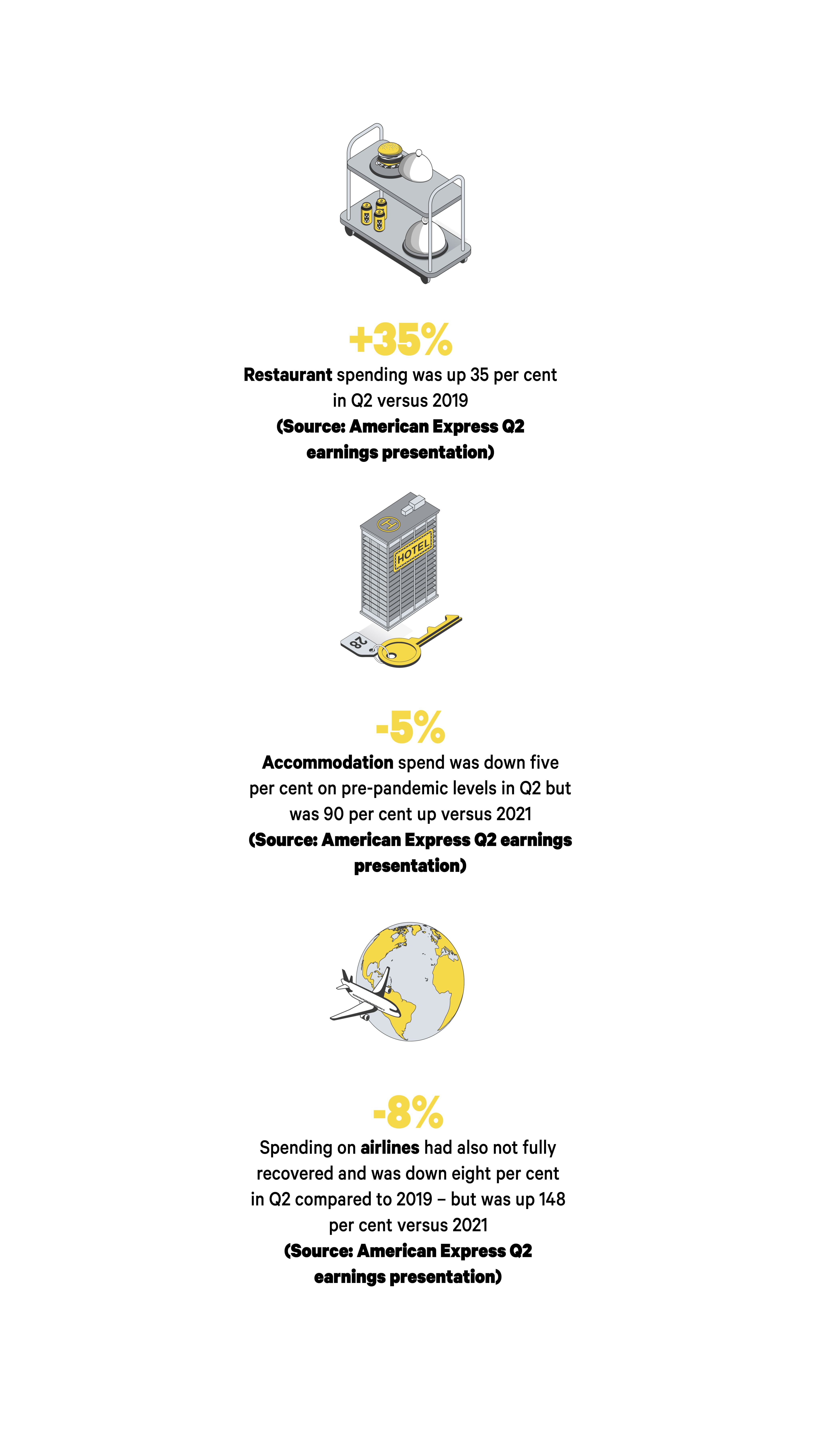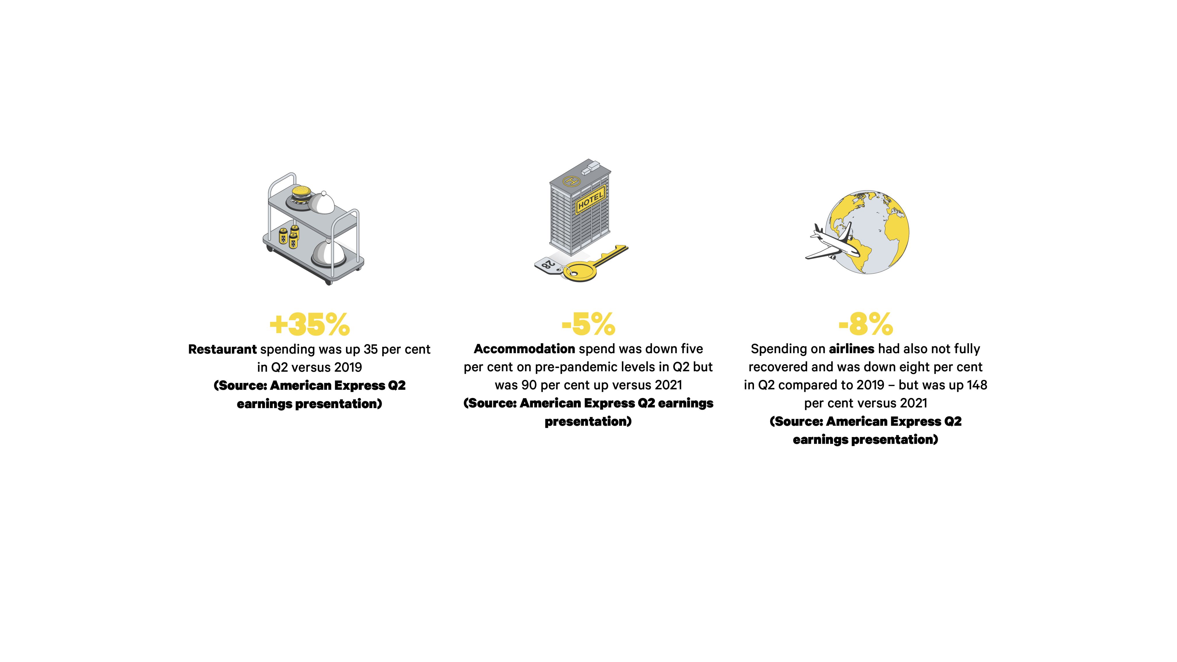 Contrast: Restaurant spend recovered to pre-Covid levels in Q2 2022 but outlay on airlines and accommodation remained down on 2019 levels – albeit markedly up compared to a year prior, unsurprisingly, when international travel restrictions were widespread