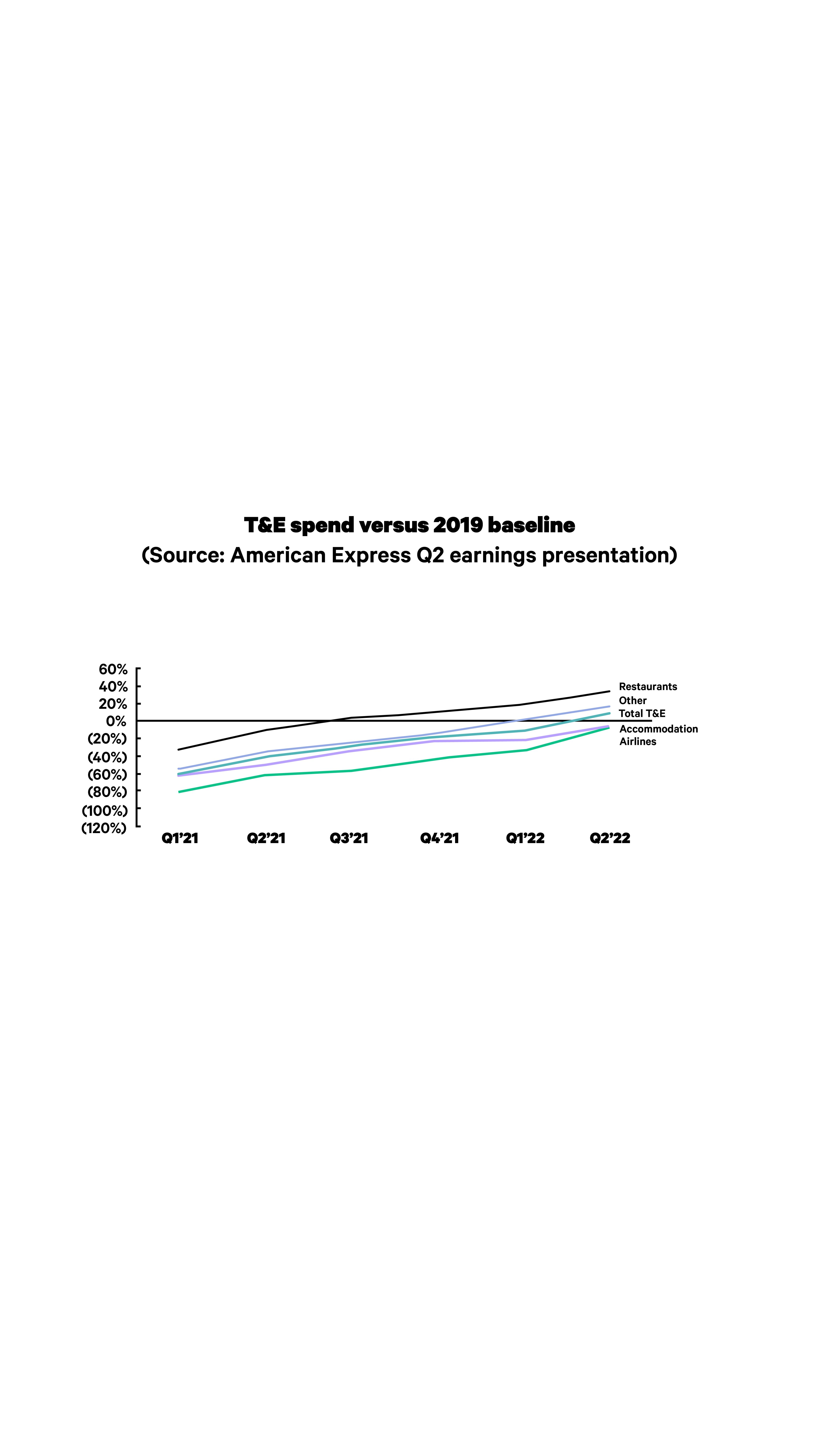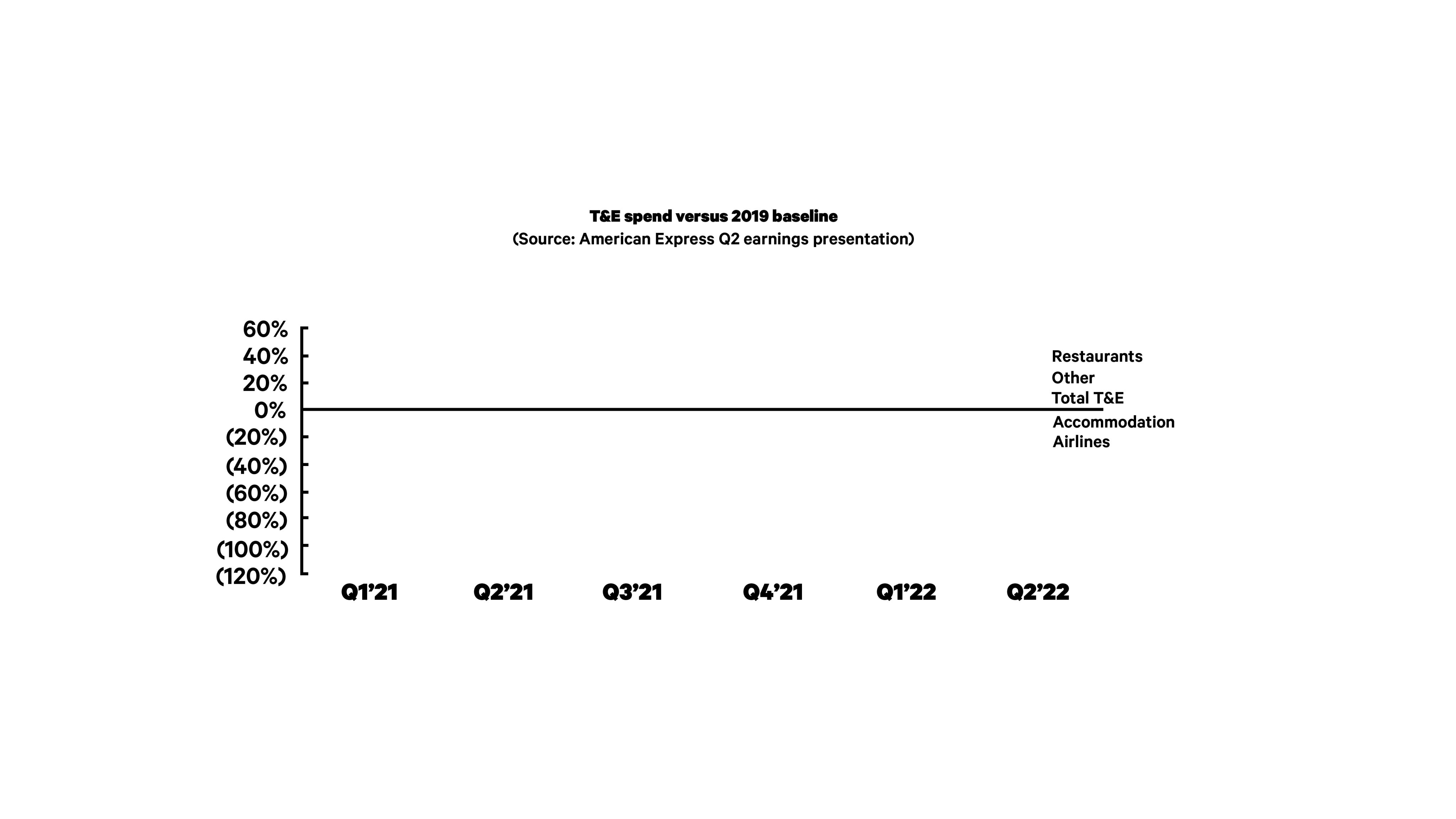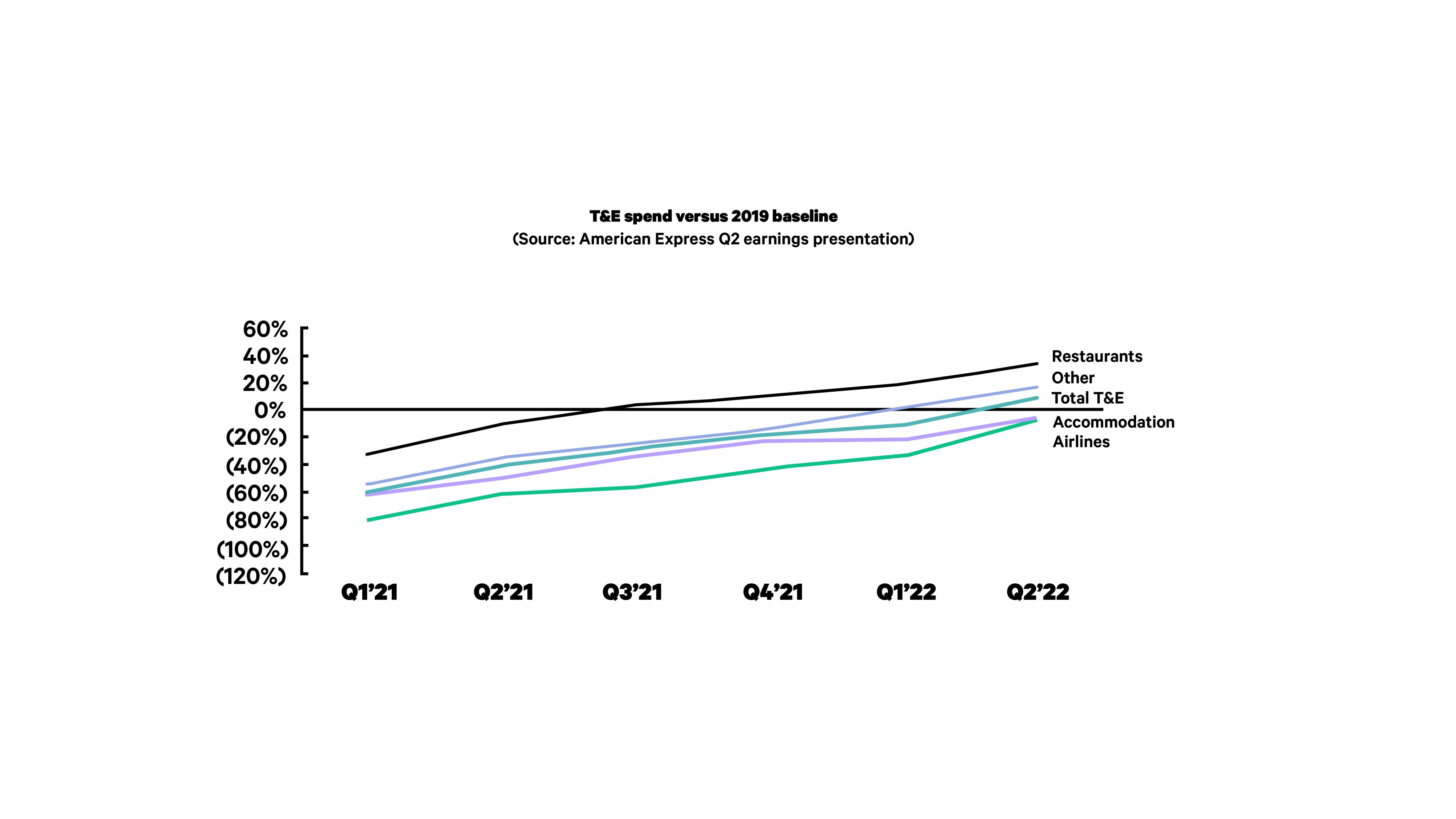 Rates of recovery: Restaurant spend on corporate cards returned to 2019 volumes as early as mid-2021 but accommodation and airline spend are taking longer to recover. Nevertheless, airline spend closed the gap to accommodation spend in the second quarter of 2022.