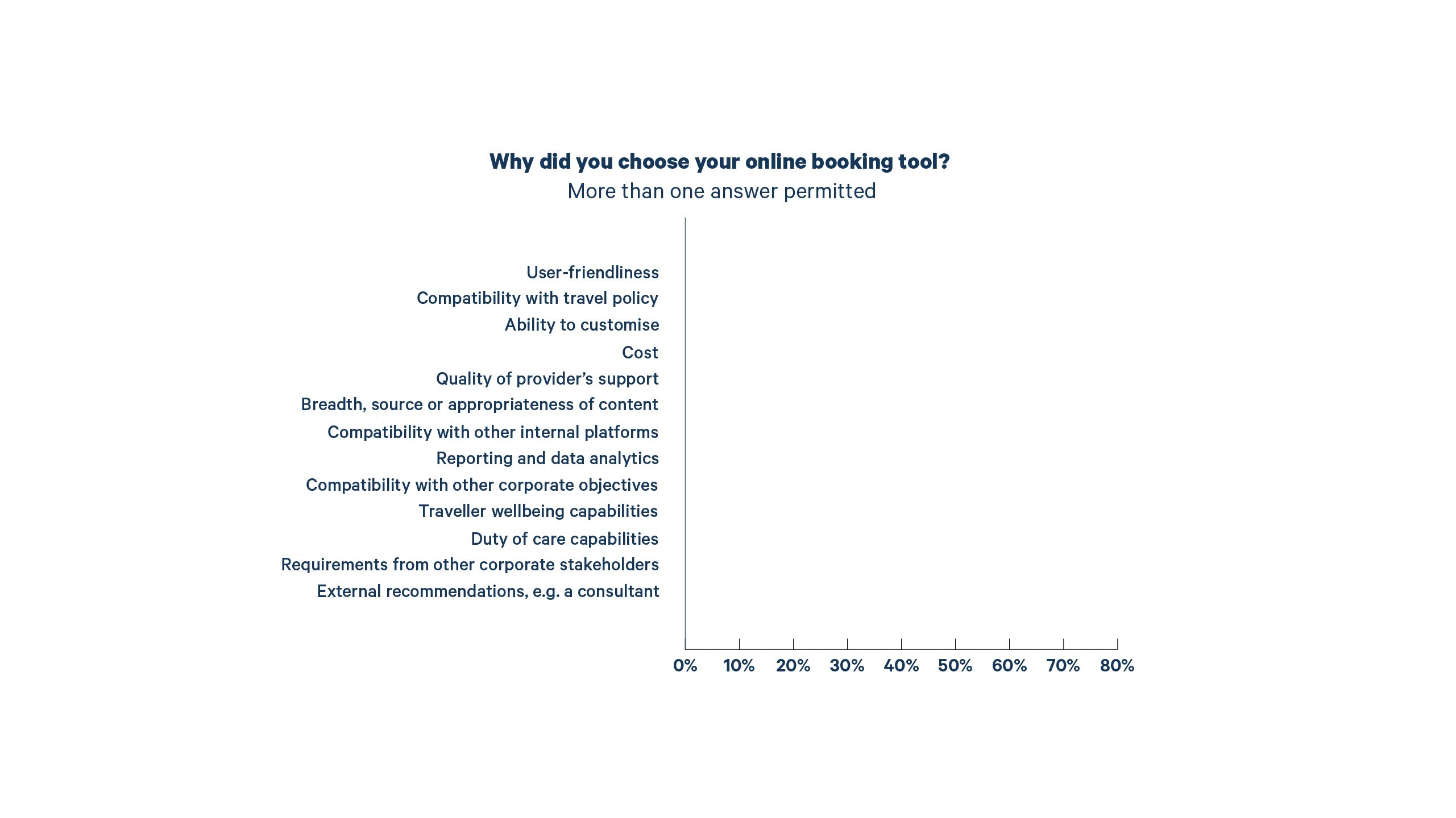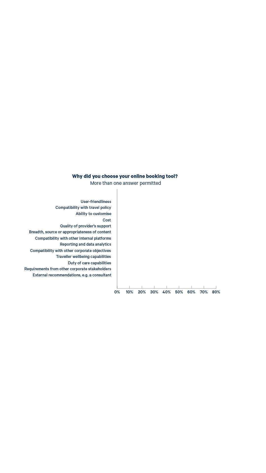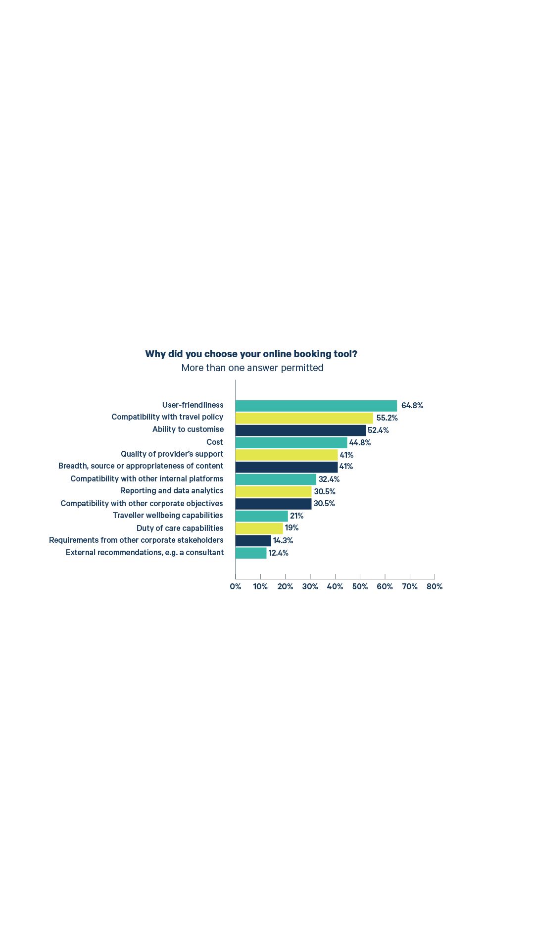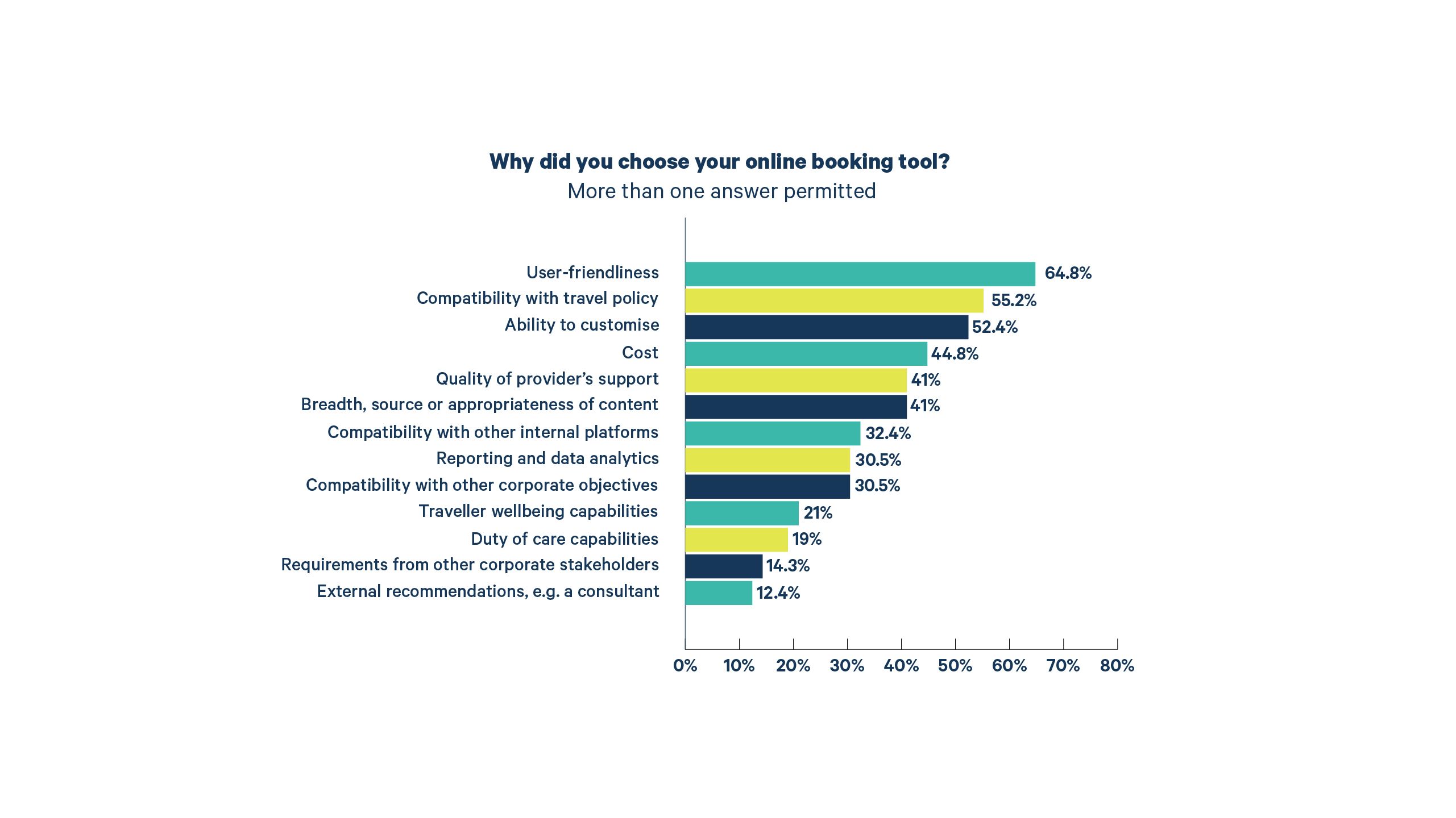 Asked why they chose their current tool, 65 per cent cited user-friendliness. Travel buyers and procurement managers are keen to ensure travellers are satisfied, and in a world where individuals are accustomed to user-friendly technology in their home lives, it is no wonder travel managers are trying to emulate that in the workplace, despite the challenges of doing so.