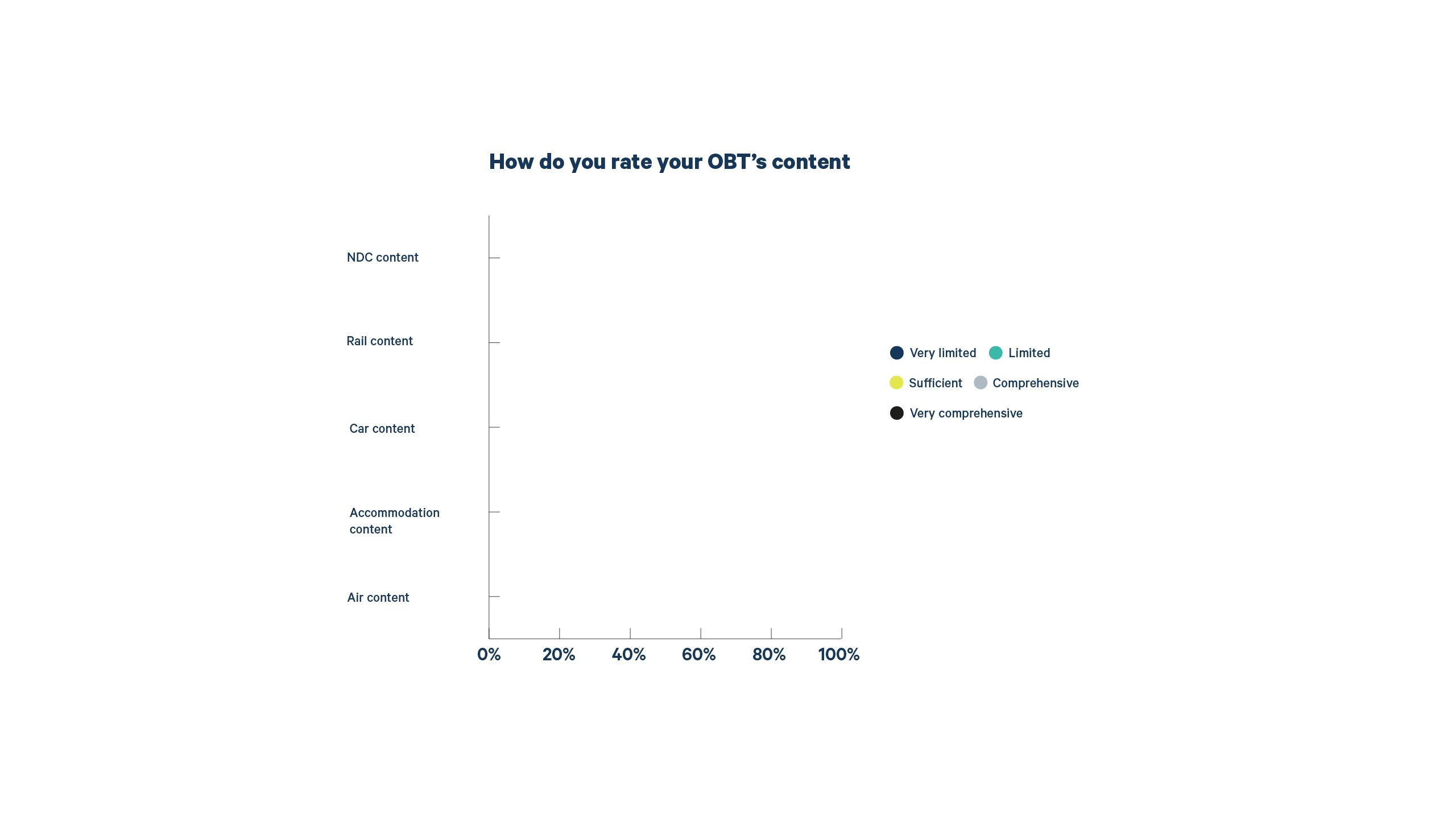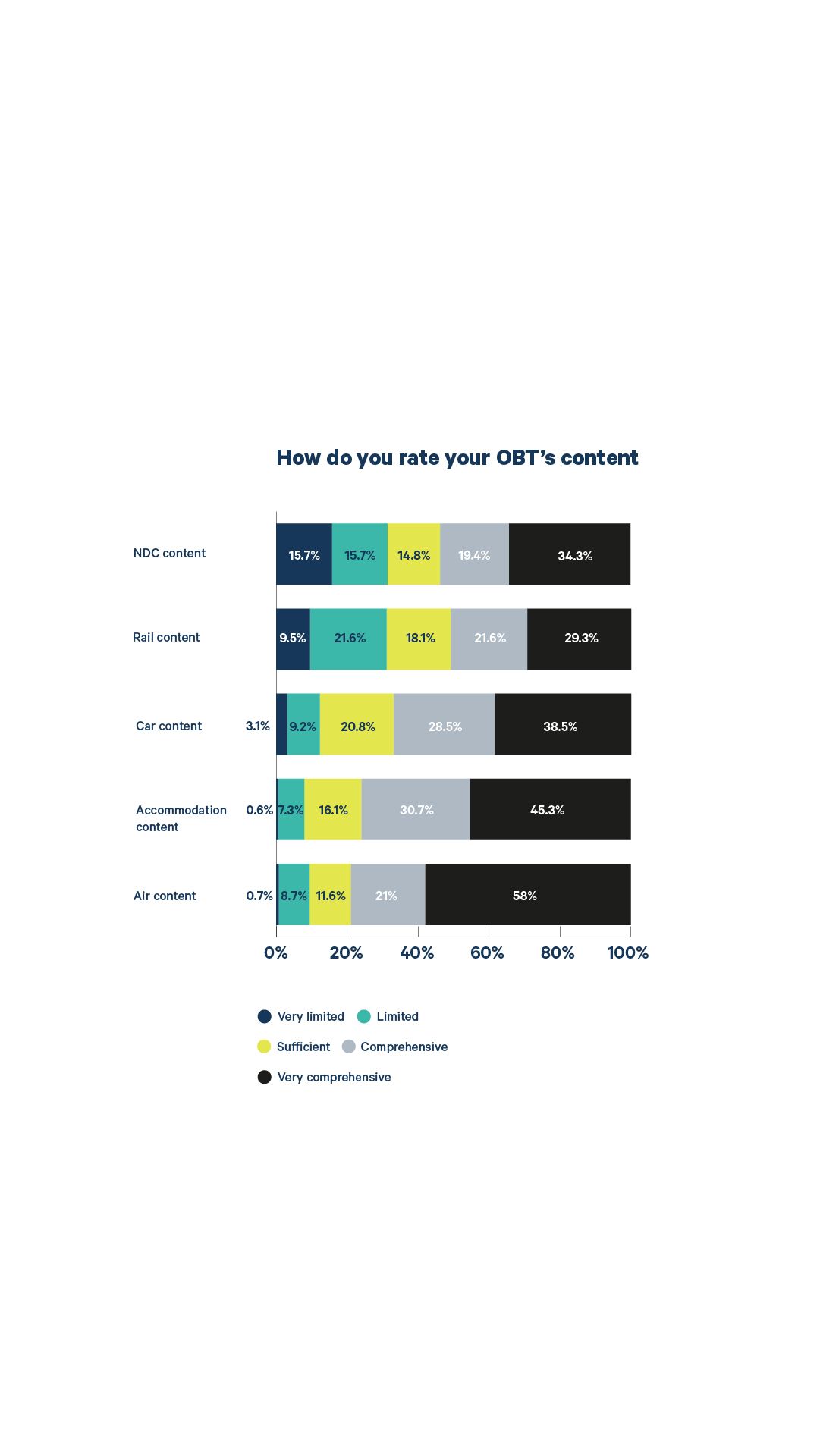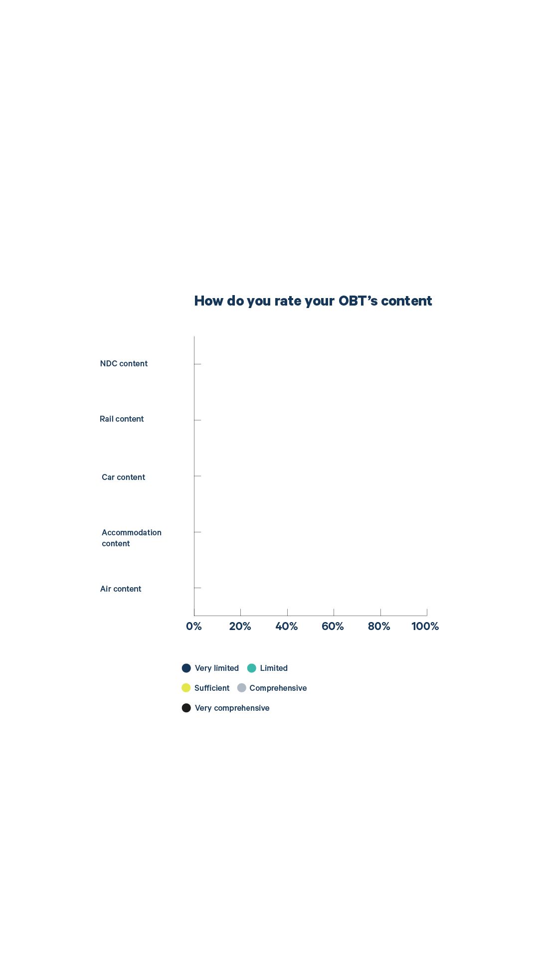 The chart below shows the breakdown into air, accommodation, rail and car content. Buyers were convinced that air and accommodation content were comprehensive or very comprehensive. A lack of rail content or relevant rail content was a clear problem for many travel buyers. While in the US this can be chalked up to a lack of options overall, in Europe it more likely reflects the huge fragmentation in the market for rail travel between countries and even within countries.