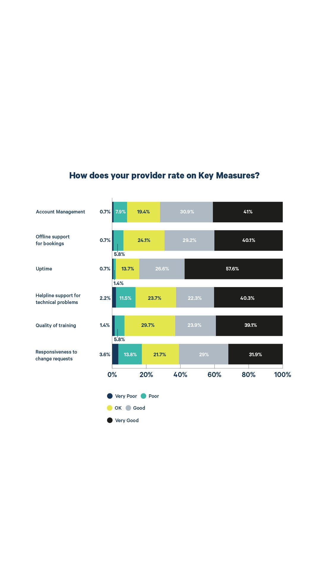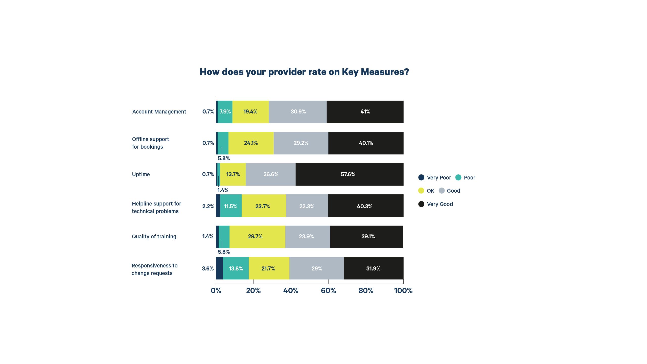 BTN Europe also asked corporate buyers about how they ranked their providers on a collection of key measures seen in the chart below. Of these, many users said their online booking tool providers were not responsive to change requests while others felt the training they received was not as good as it could be. On a more technical note, most corporates said their tool enjoyed good uptime and few were left unable to make bookings at important times.
