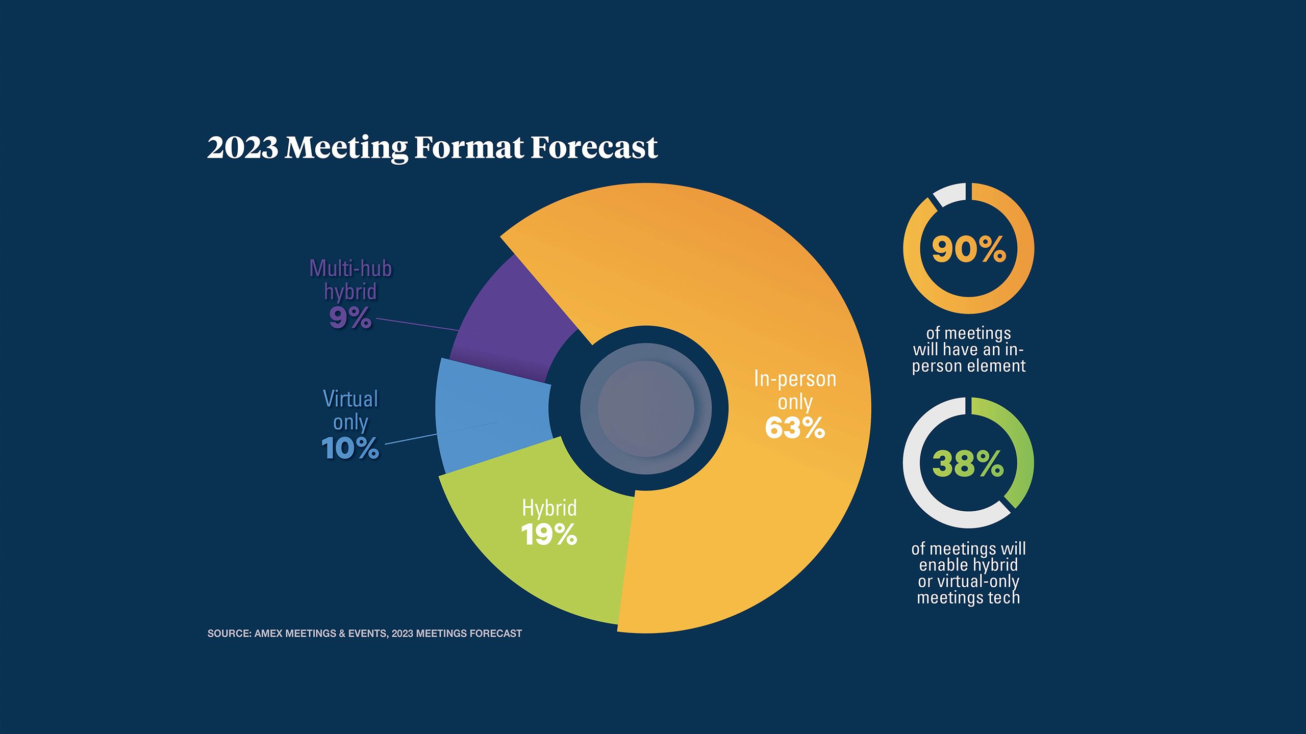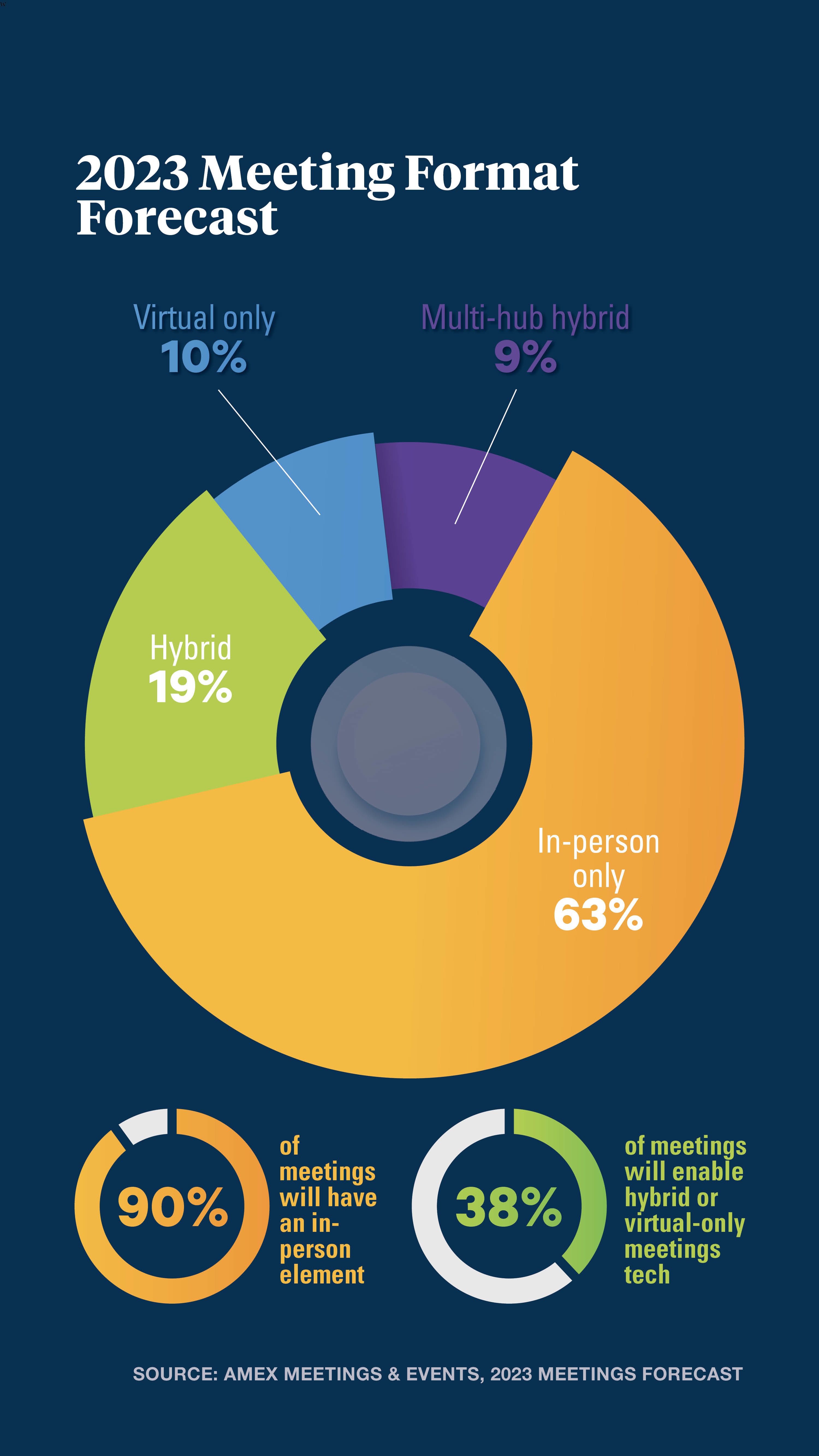 About 90 per cent of meetings are projected to have an in-person element next year, compared with 88 per cent in 2022, according to American Express Meetings & Events’ 2023 forecast. Looking at the numbers the other way around, however, is also important. Fully 38 per cent of meetings, according to this forecast, will incorporate some type of hybrid or virtual meetings technology in 2023.
