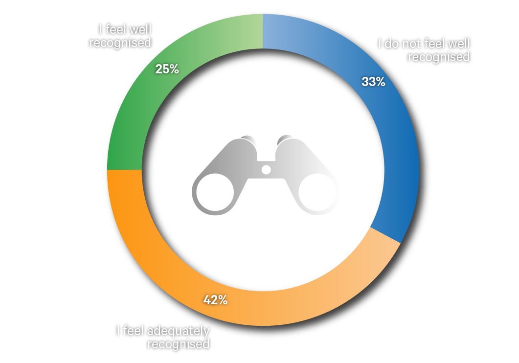 One-third (33%) of European travel managers do not feel they get the recognition they deserve within their company, according to this year's survey – an increase of 4% compared to last year. The proportion of respondents who feel adequately recognised fell a single percentage point to 42%, while 25% (-3% year-on-year) said they feel well recognised within their company.